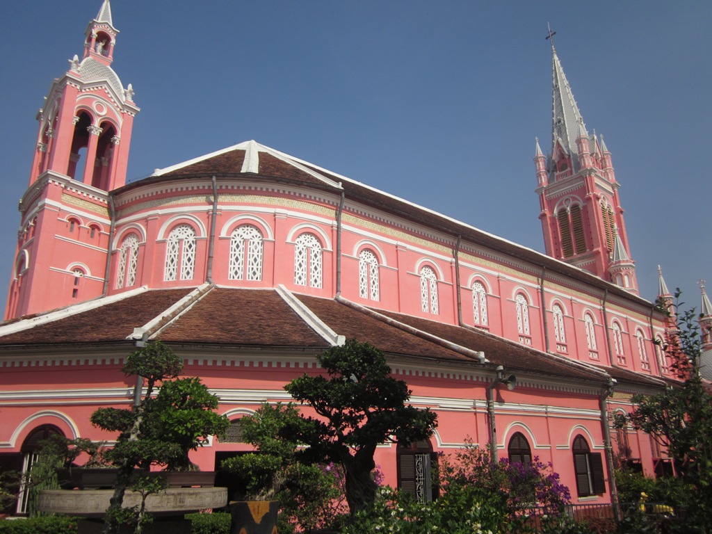 L’Église couleur rose bonbon d’Ho Chi Minh City Il est des monuments où des lieux qui ne laissent pas indifférent. Et ce pourrait être le cas de l’Église Tan Dinh. Non pas tant pour son architecture ou sa hauteur, et non pas parce qu’elle fut bâtit par les Français au 19ème siècle, mais bien de par sa couleur rose bonbon qui tranche nettement aves les autres édifices de la ville. C’est en remontant la rue Hai Ba Trung que vous la trouverez, près du Marché Tan Dinh. Vous la reconnaîtrez facilement de par ses vives couleurs mais aussi son superbe clocher qui semble échappé aux caprices du climat au Vietnam. Seconde église…