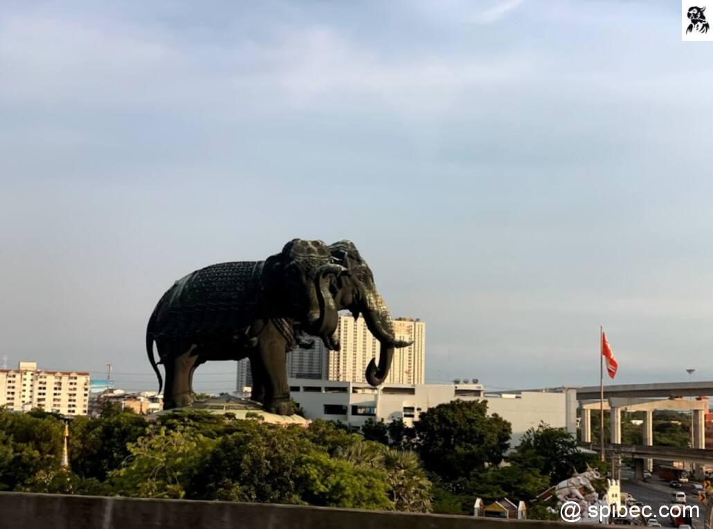 Absent de nombreux guides papiers le musée d’Erawan et très peu visité des touristes. Situé non loin de l’autoroute, loin du centre-ville, dans un quartier périphérique, le musée se voit de loin, de très loin. La statue d’Erawan, le dieu de tous les éléphants, trône sur promontoire, elle domine tout du haut de ses 43,6 mètres. L’éléphant à trois têtes est un géant de la construction, les qualificatifs manquent, les mesures parlent d’elles même : hauteur de la bête 29 mètres, pour une largeur de 12 mètres et une longueur de 39 mètres. Le poids de l’éléphant ne fait pas rigoler non plus : 150 tonnes, la tête pèserait à…